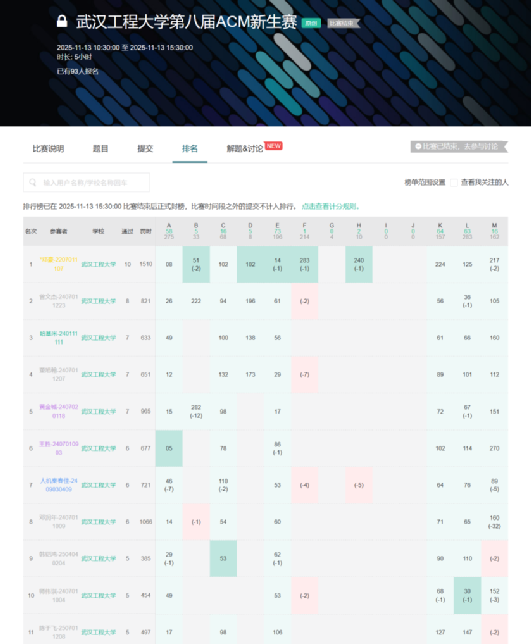 (通讯员 王杨晶 陈灯)2025年11月13日,由我校创新创业学院主办,计算机科学与工程学院、人工智能学院和ACM协会承办的武汉工程大学第八届ACM程序设计新生赛在计算机学院成功举办。此次比赛面向全校各专业2024级和2025级学生,旨在激发我校学生学习计算机算法设计的热情,选拔并培养一大批算法类赛事选手,为ICPC国际大学生程序设计竞赛、蓝桥杯全国软件和信息技术专业人才大赛、中国高校计算机大赛-天梯赛等储备选手,组建学生梯队。