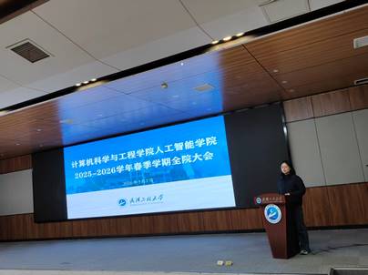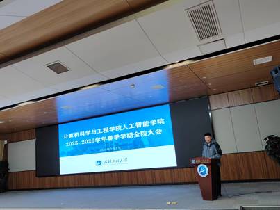 本网讯(通讯员 陈波)3月1日下午,计算机科学与工程学院人工智能学院在图灵报告厅召开2025-2026学年春季学期全体教职工大会,部署2026年重点工作。学院领导班子成员、全体教职工参加会议。会议由学院党委书记张炜主持。