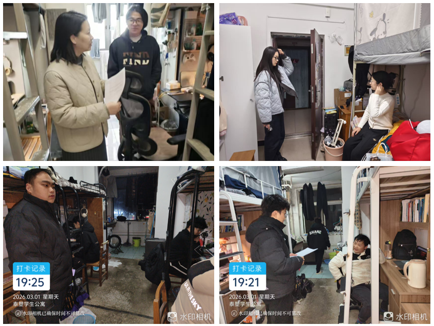 返校期间,学院辅导员和班主任深入学生宿舍,走访慰问返校学生,倾听学生假期生活与新学期规划,及时回应学生关切。同时,叮嘱同学们注意用电安全、保持宿舍整洁,营造积极向上、团结友爱的宿舍氛围。