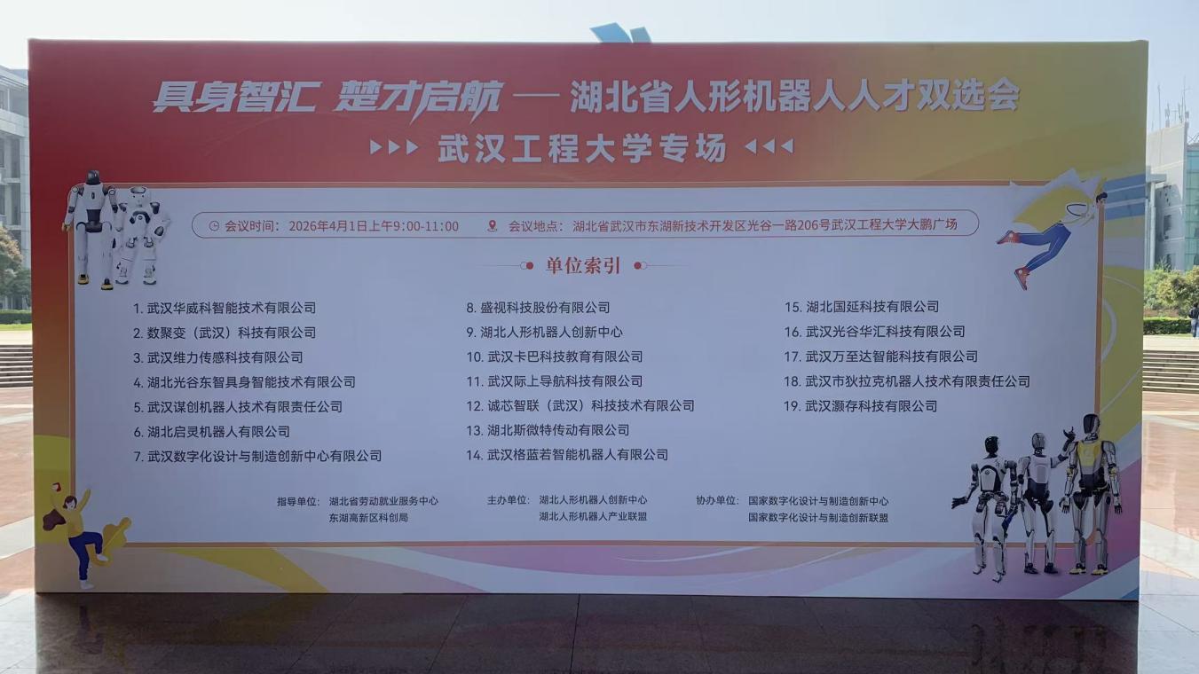 本次双选会由湖北省劳动就业服务中心、东湖高新区科创局指导,湖北人形机器人创新中心、湖北人形机器人产业联盟主办,国家数字化设计与制造创新中心、国家数字化设计与制造创新联盟协办,吸引了武汉华威科智能技术有限公司、数聚变(武汉)科技有限公司、湖北光谷东智具身智能技术有限公司等 19 家省内人形机器人领域头部企业、创新平台参会,岗位覆盖算法研发、机械设计、智能系统开发、技术运维等全产业链,为我校学子提供了数百个优质就业岗位,精准匹配人工智能、计算机科学与技术、自动化、数据科学与大数据技术等专业的人才培养方向。